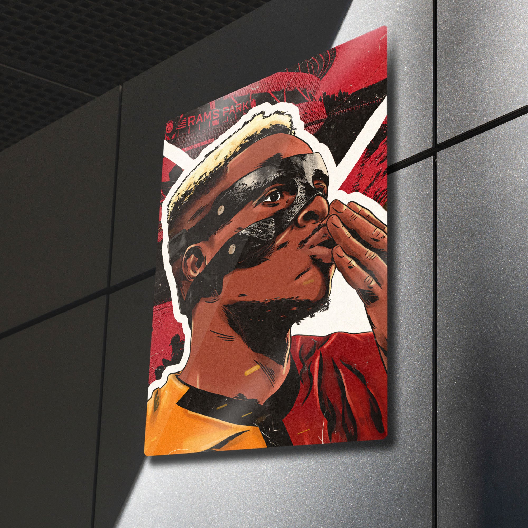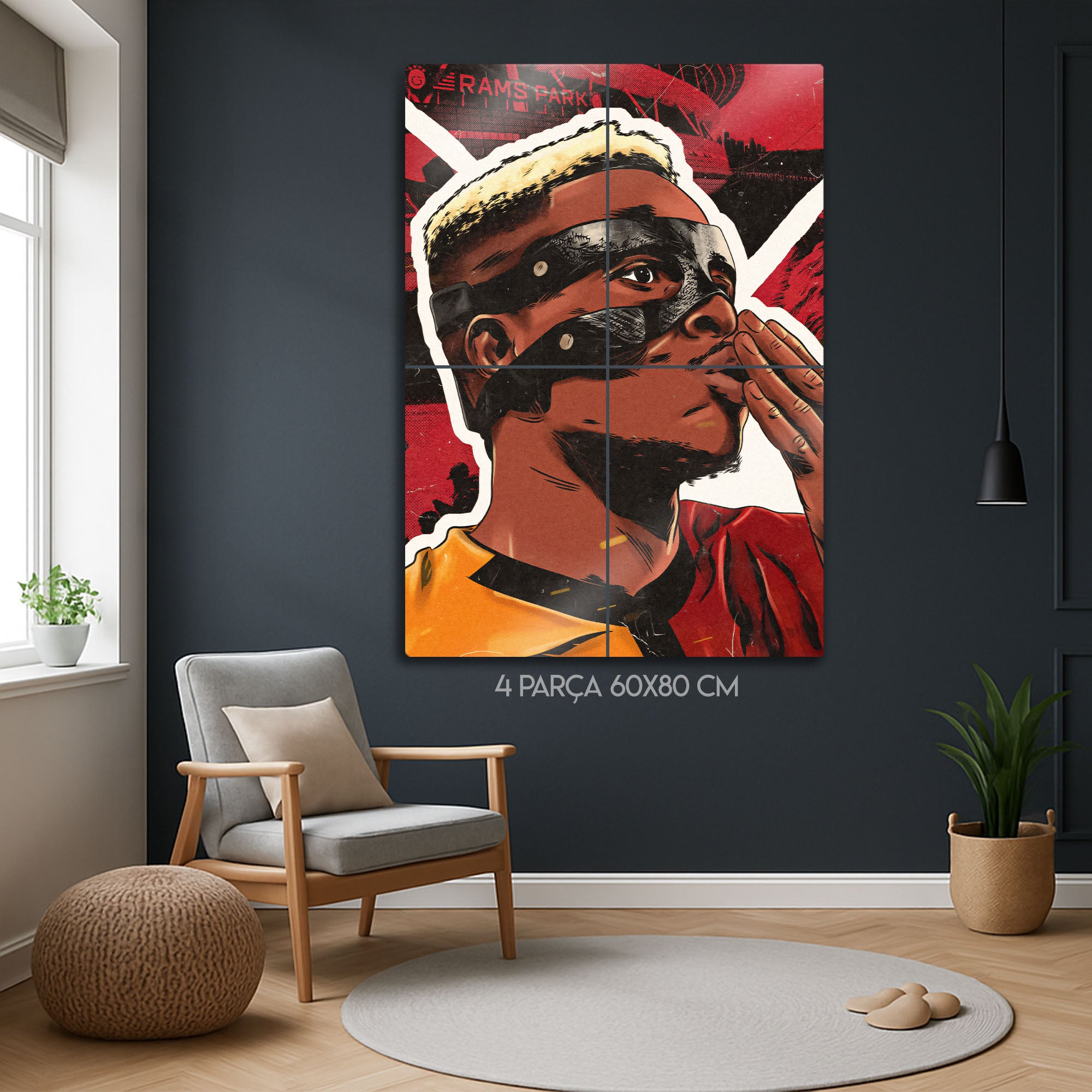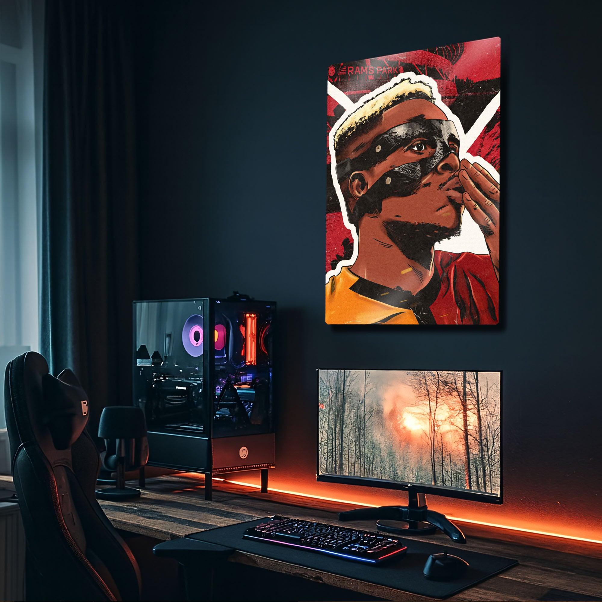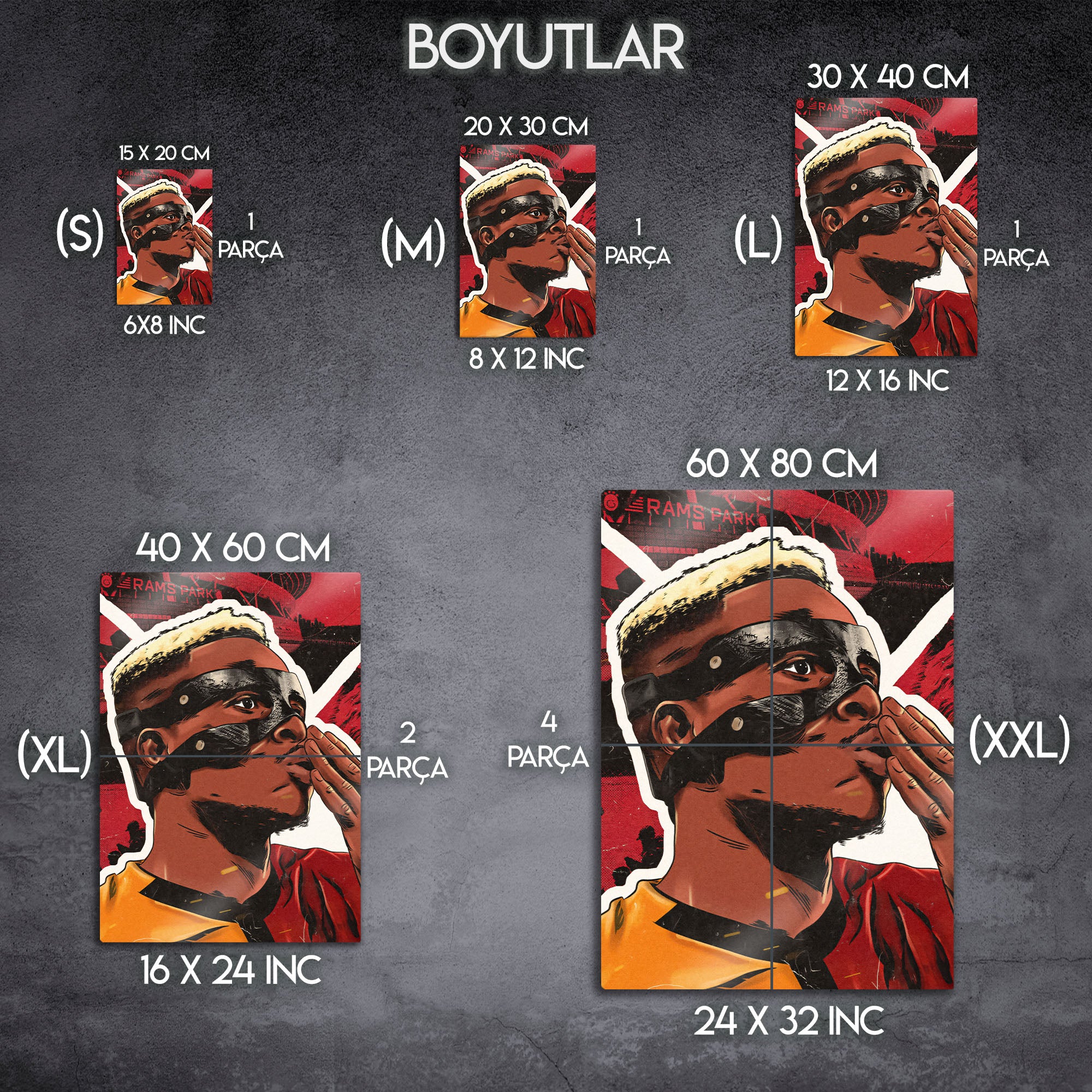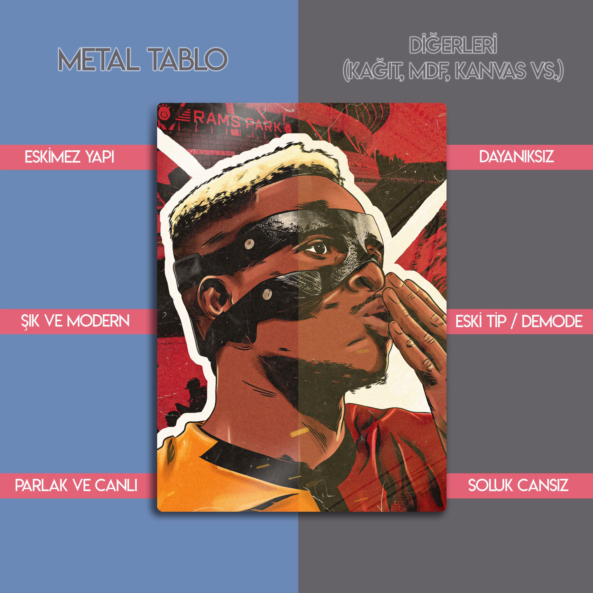 Galatasaray'ın yıldızı, Serie A'nın gol kralı, Napoli'nin süperstarı Victor Osimhen'in sahadaki o durdurulamaz ve savaşçı ruhunu duvarlarınıza taşıyın! Bu özel tasarım metal tablo, Osimhen'in imzası haline gelen koruyucu maskesiyle o ikonik ve karizmatik duruşunu, kendi imzasıyla birlikte ölümsüzleştiriyor.