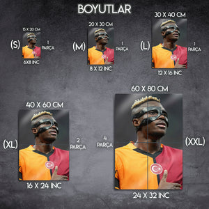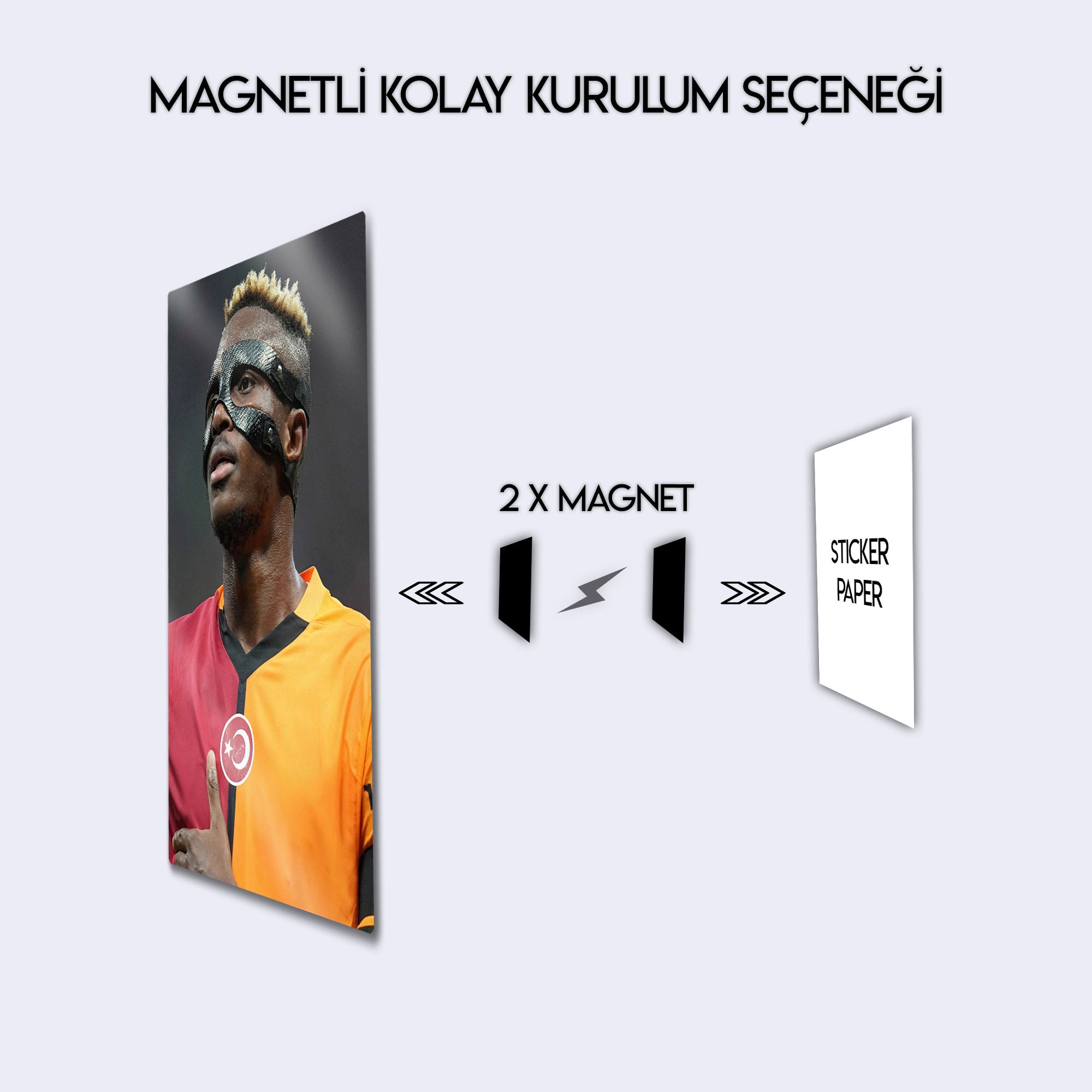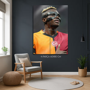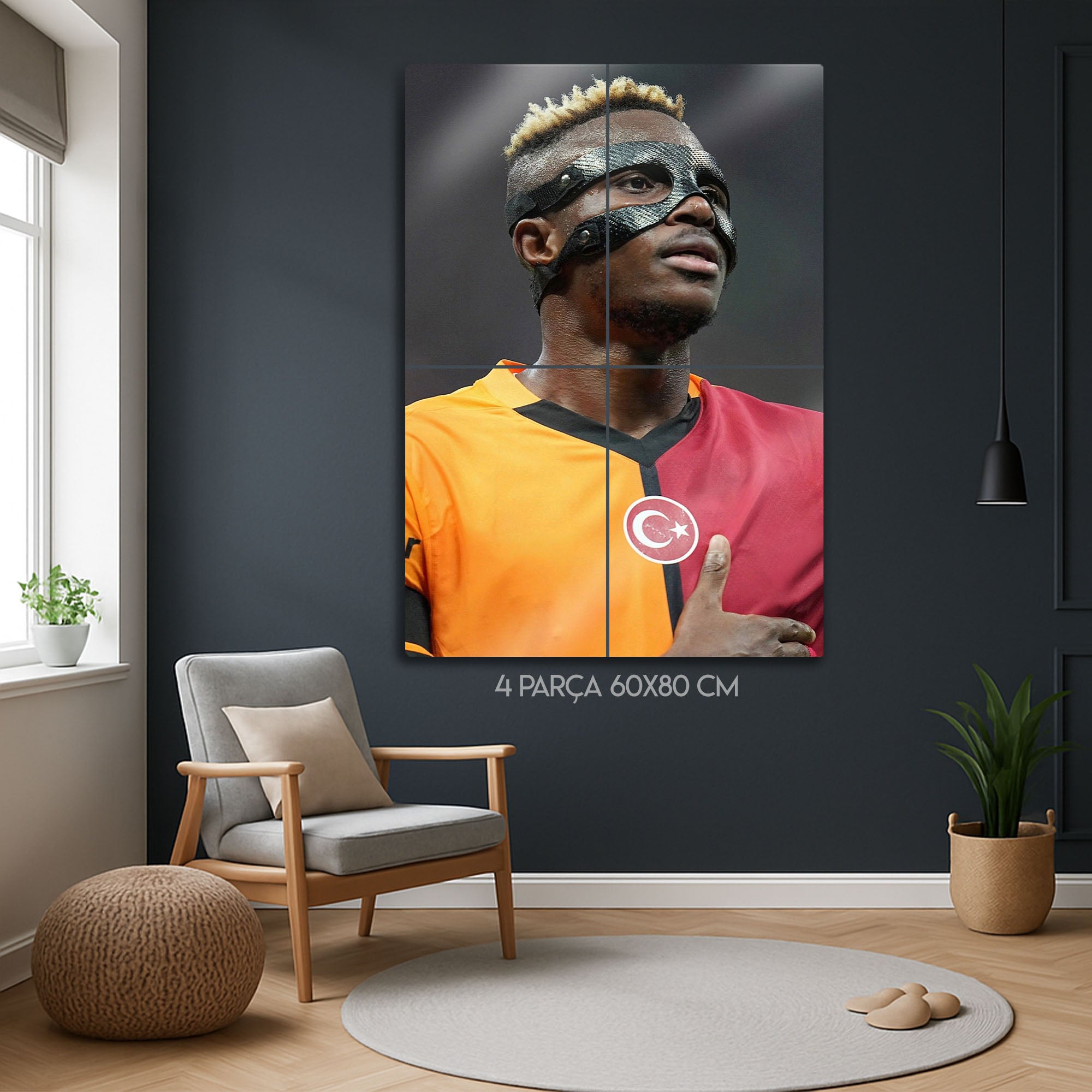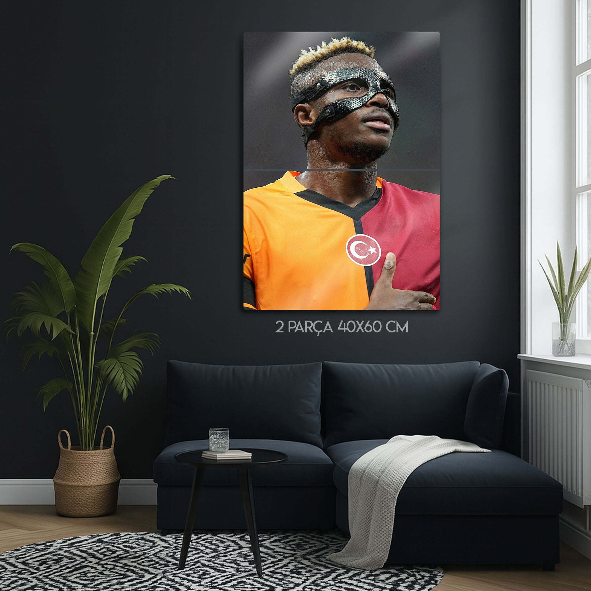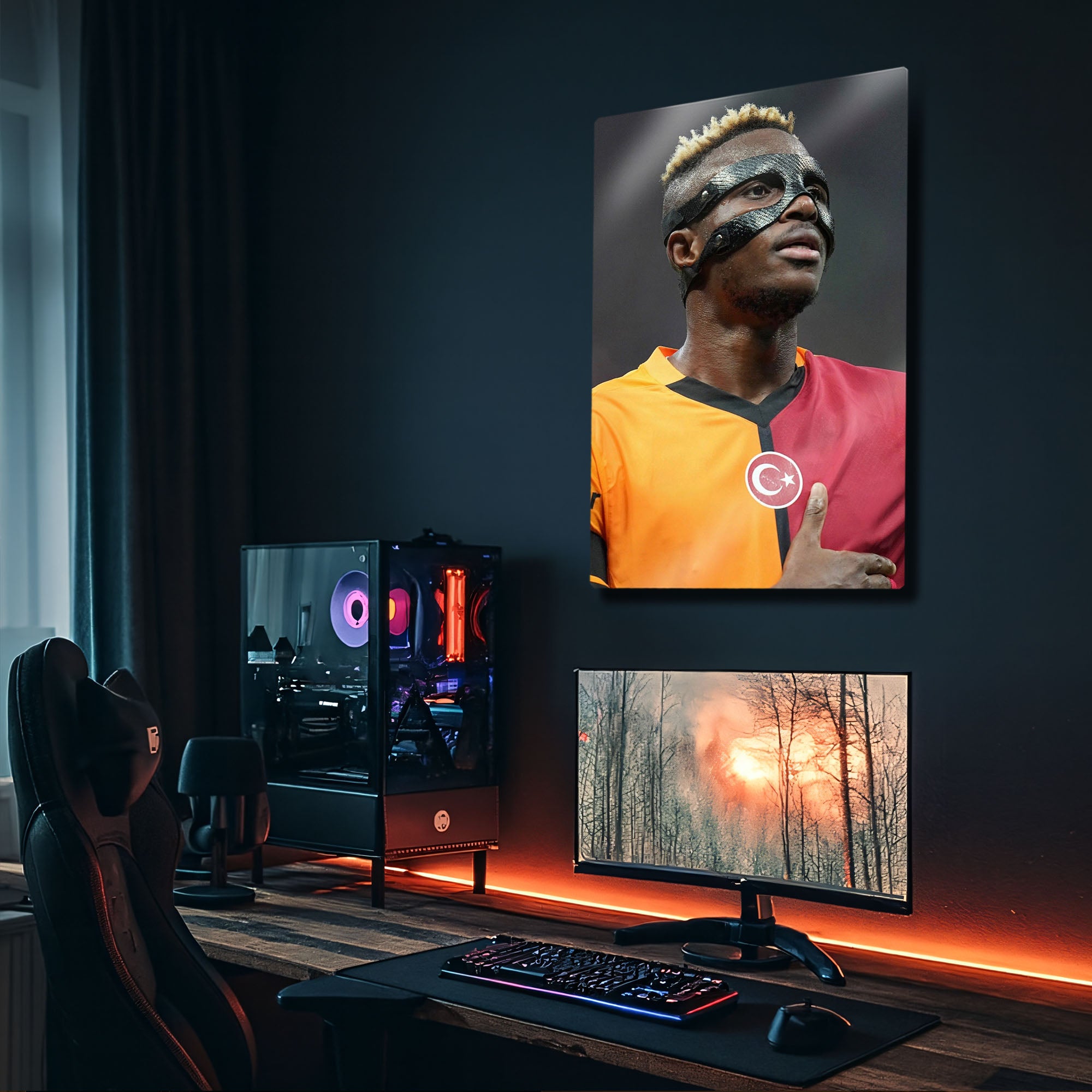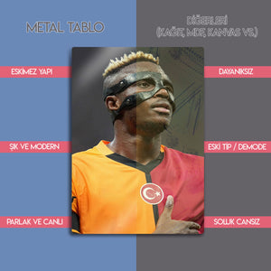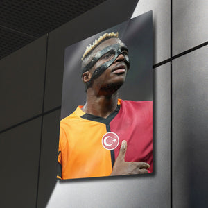 Galatasaray'ın yıldızı, Serie A'nın gol kralı, Napoli'nin süperstarı Victor Osimhen'in sahadaki o durdurulamaz ve savaşçı ruhunu duvarlarınıza taşıyın! Bu özel tasarım metal tablo, Osimhen'in imzası haline gelen koruyucu maskesiyle o ikonik ve karizmatik duruşunu, yüksek çözünürlüklü bir portreyle ölümsüzleştiriyor.