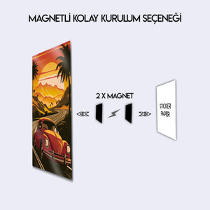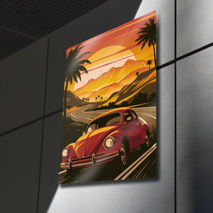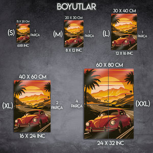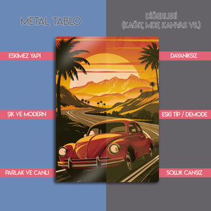 Özgürlüğün, maceranın ve yolculuğun o nostaljik ruhunu duvarlarınıza taşıyın! Bu olağanüstü metal tablo, tüm zamanların en sevilen otomobillerinden biri olan klasik Volkswagen Beetle'ı (Vosvos), palmiye ağaçları arasında, gün batımına doğru uzanan virajlı bir yolda, retro bir seyahat afişi estetiğiyle yeniden canlandırıyor.