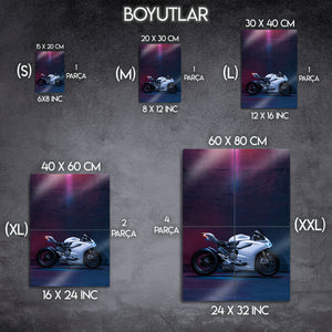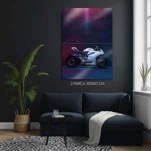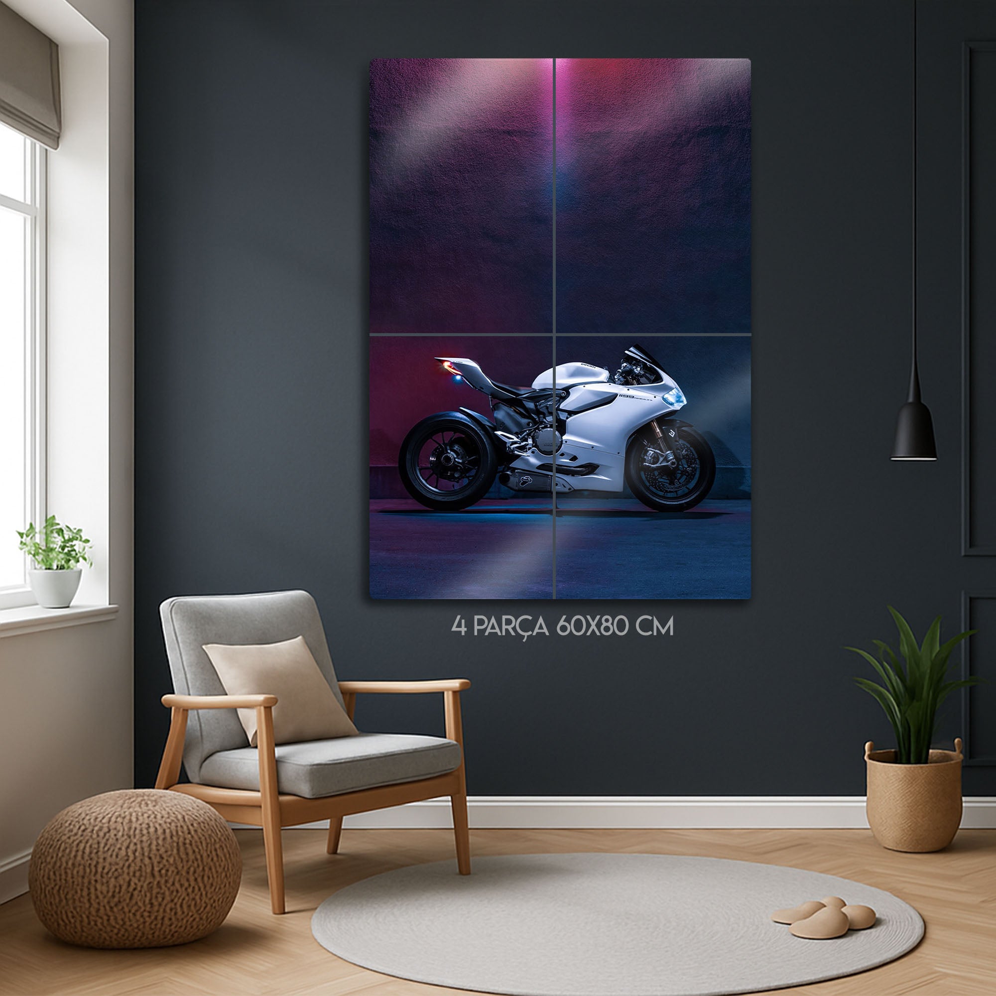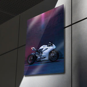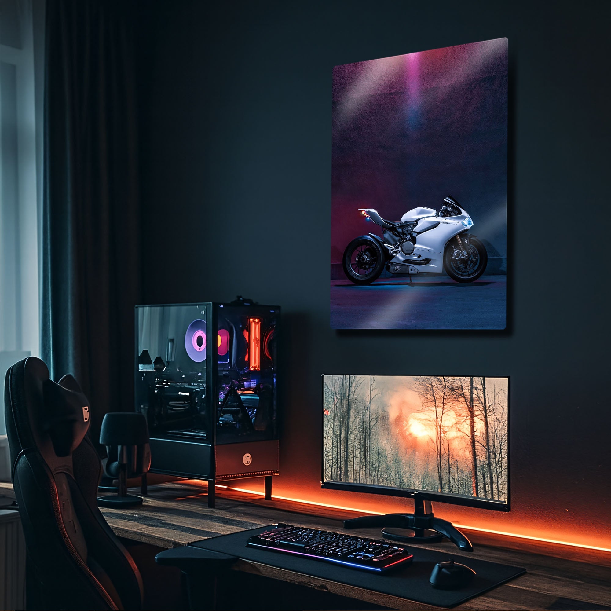 İtalyan tasarımının ve mühendisliğinin saf estetiğini duvarlarınıza taşıyın. Bu olağanüstü metal tablo, motosiklet dünyasının ikonlarından biri olan beyaz Ducati Panigale 1199'u, mor ve kırmızı neon ışıkların yarattığı dramatik ve modern bir atmosferde sergiliyor.