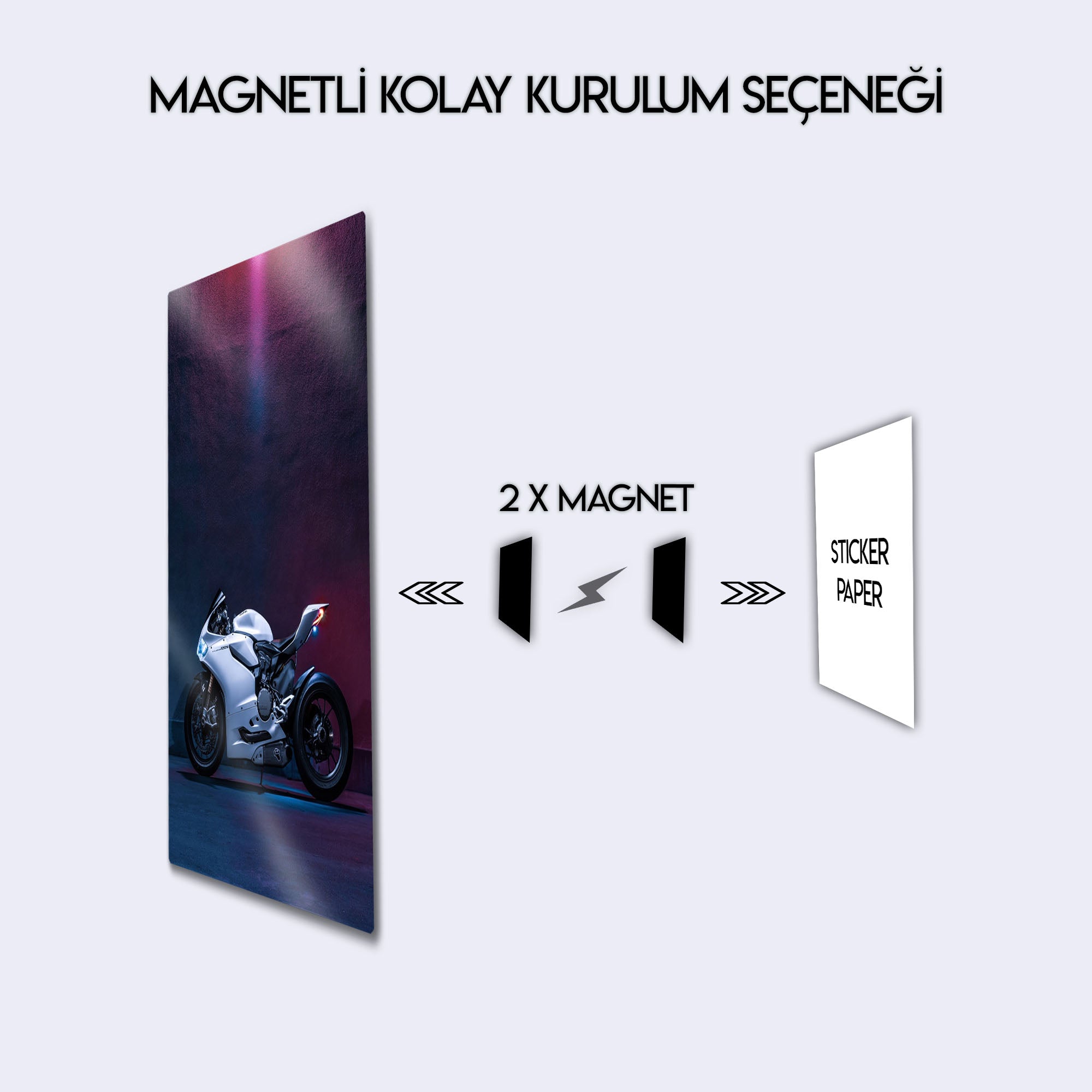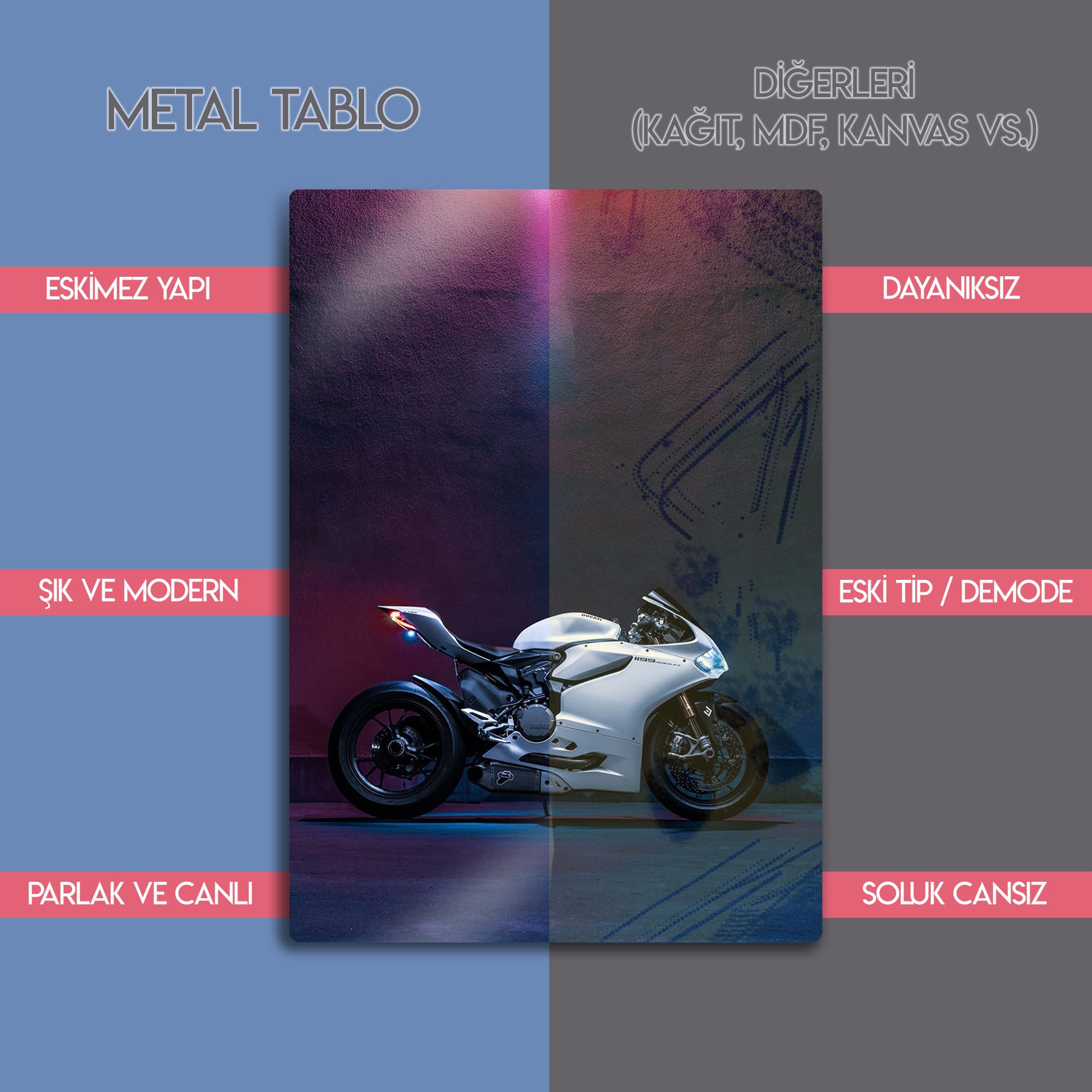Bu eser, her motor ve hız tutkununun hayallerini süsleyen, bir sanat eseri niteliğindeki bu makinenin her bir kıvrımını ve agresif hatlarını vurguluyor. Metalin modern ve pürüzsüz yüzeyi, motosikletin inci beyazı rengini ve ışık oyunlarını mükemmel bir şekilde yansıtarak, tasarıma derinlik ve lüks bir hava katıyor. Garajınız, "man cave"iniz, ofisiniz veya modern salonunuz için mükemmel bir "statement" parçasıdır.