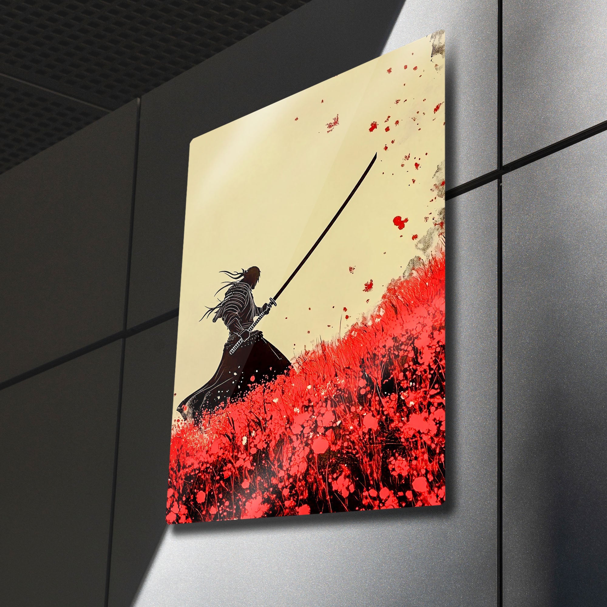 Bir savaşçının yalnızlığını, onurunu ve doğanın vahşi güzelliğini duvarlarınıza taşıyın. Bu olağanüstü metal tablo, geleneksel Japon mürekkep sanatı (Sumi-e) estetiğinden ilham alarak, kan kırmızısı çiçeklerle dolu bir tarlada duran yalnız bir samurayın (ronin) güçlü silüetini tasvir ediyor.