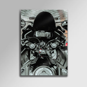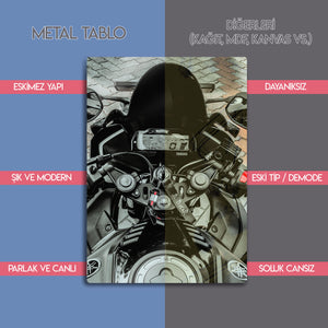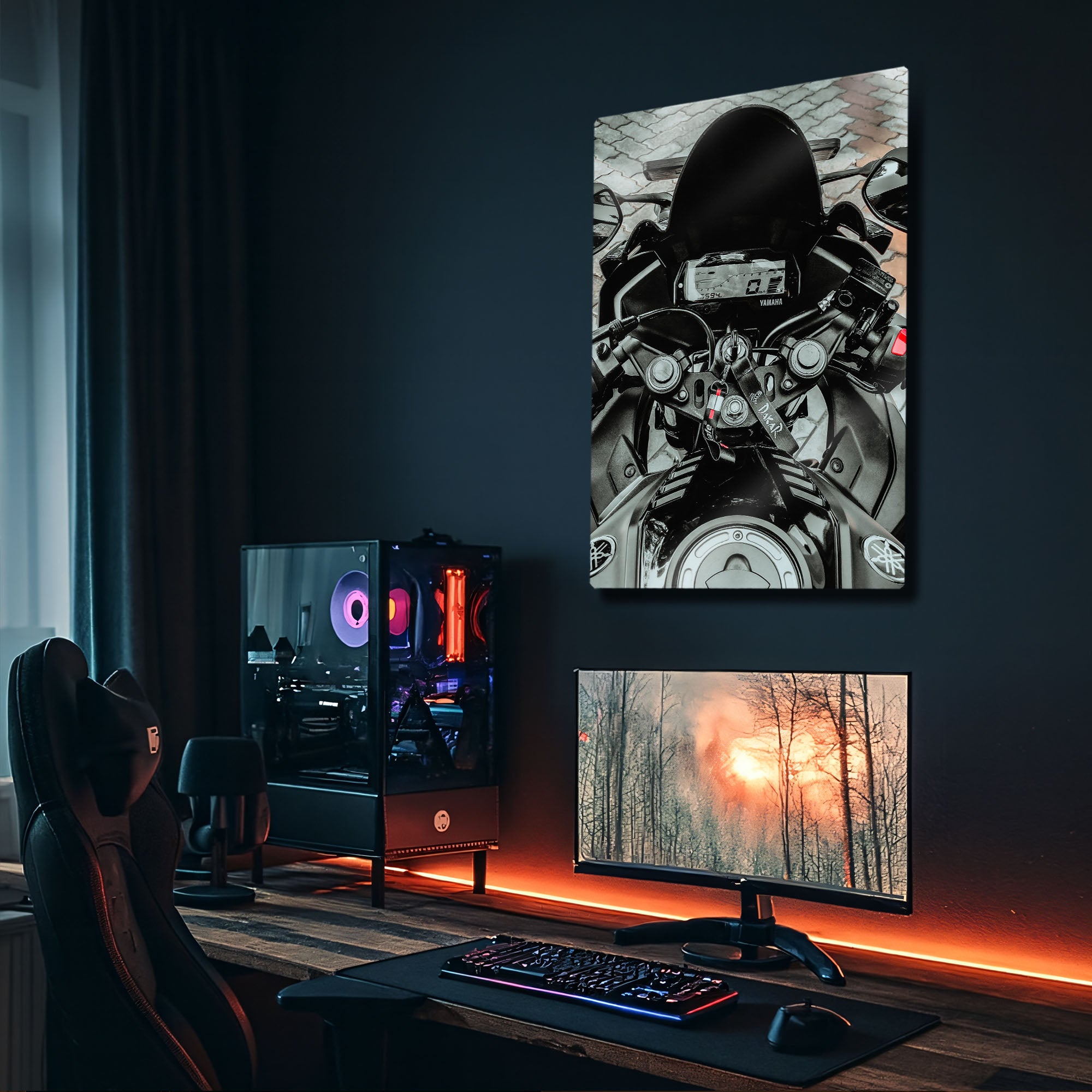Yolun çağrısını, hızın heyecanını ve bir yarış makinesinin kokpitindeki o eşsiz anı duvarlarınıza taşıyın. Bu olağanüstü metal tablo, bir Yamaha R serisi motosikletin sürücü gözünden (POV - Point of View) çekilmiş, son derece atmosferik ve detaylı bir fotoğrafını sunuyor.