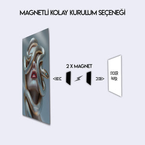 Bu eser, sadece mitolojik bir figürün tasviri değil, aynı zamanda gücün, ihanetin ve kadınlığın karmaşıklığı üzerine düşündüren, derin bir sanat eseridir. Yüksek kaliteli metal malzeme üzerine yapılan bu hiper-realist illüstrasyon, yılanların her bir pulunu, metalik dokusunu ve o anın büyüleyici atmosferini inanılmaz bir derinlikle yansıtır.
