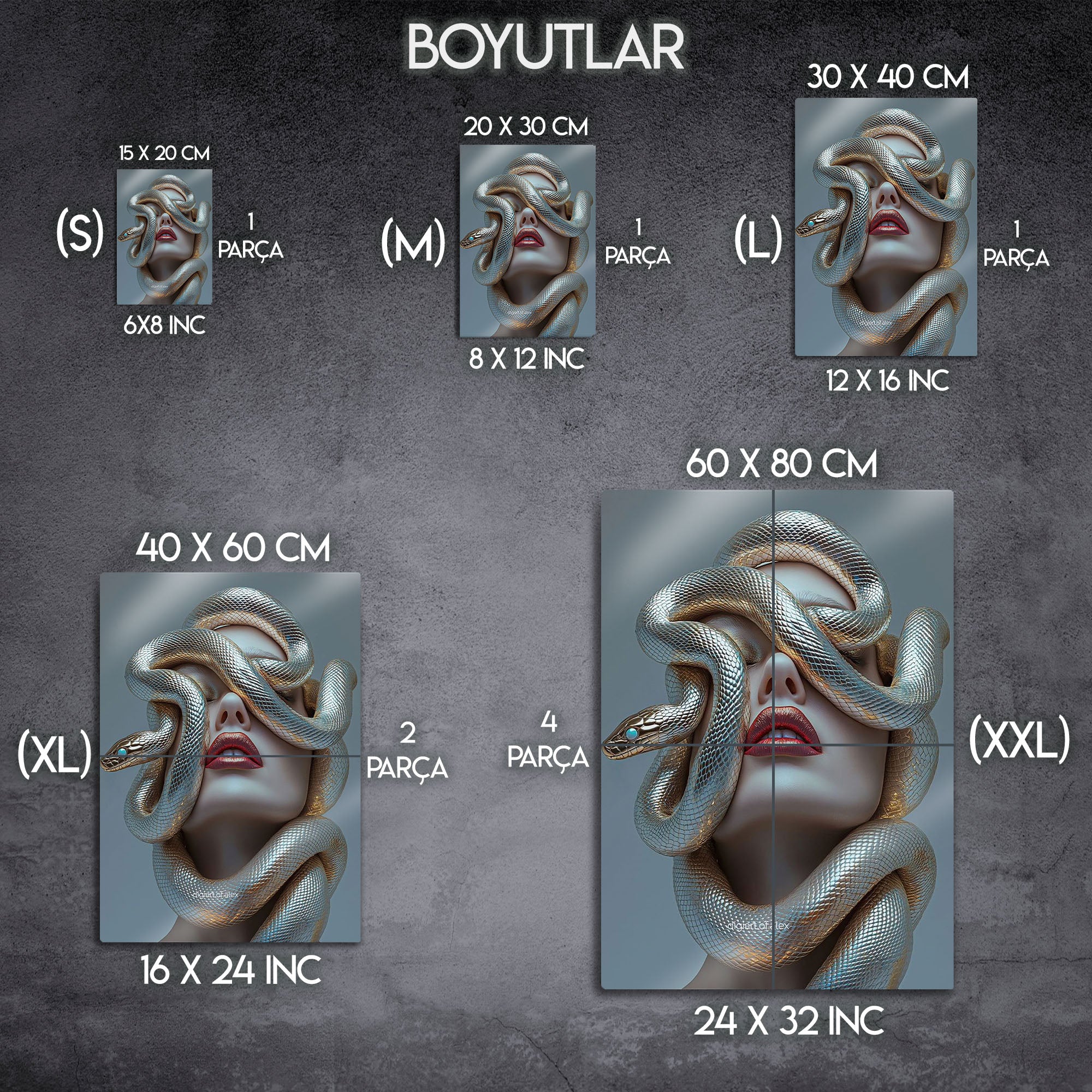 Yunan mitolojisinin en trajik ve en güçlü figürü Medusa'nın o hipnotize edici ve tehlikeli güzelliğini, modern bir sanat yorumuyla duvarlarınıza taşıyın. Bu olağanüstü metal tablo, Medusa'yı, yüzünü saran parlak altın ve gümüş yılanlarla, hem kurban hem de "femme fatale" olarak yeniden hayal ediyor. Kırmızı dudakları ve kapalı gözleriyle bu portre, hem bir teslimiyeti hem de dizginlenemez bir gücü simgeliyor.